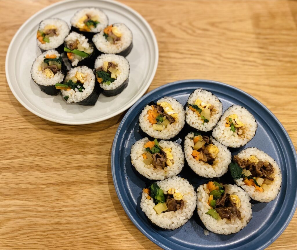 いつもの食卓はお茶碗によそったご飯、汁物、メインと副菜というラインナップだけど、キンパなら、いつもと違った華やかさが出ますよね!