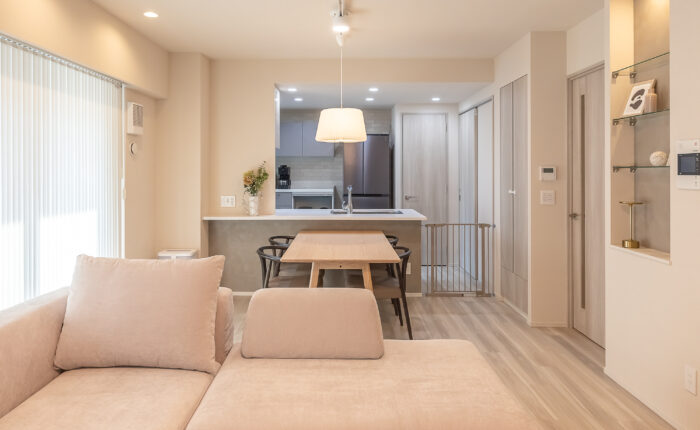 今回のマンションリフォームでは、「ほどよく背筋が伸びるソフトモダン」と、明るく親しみやすい「ナチュラルテイスト」をミックス。お子さまの成長を見守りながらも、家族の時間も、夫婦の時間も、自分の時間も大切にしたいという想いをかたちにしました。