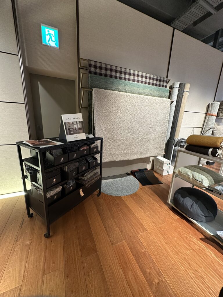 そして、憧れの KASTHALL(カスタール) のラグもたくさん展示をしていました。KASTHALL(カスタール)は、北欧・スウェーデンの自社工場で、125年以上ものあいだ世界最高峰の自然素材ラグをつくり続けるブランドです。